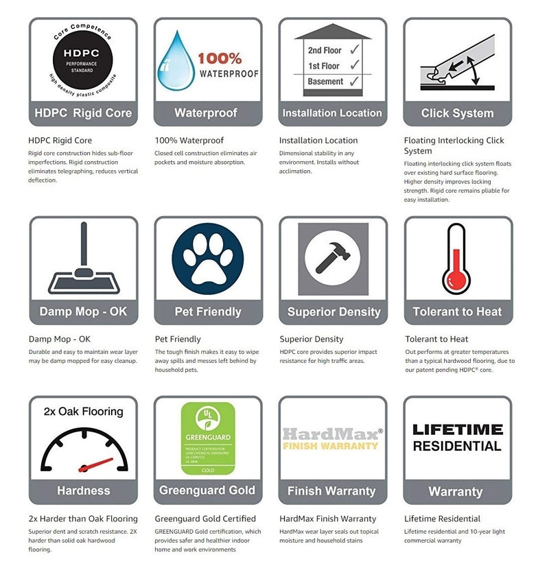 Guaranteed to outperform traditional engineered hardwood, this 100% waterproof wood couples the performance virtues of rigid core flooring with the unique “character” of real hardwood and none of the repeat patterns found in vinyl or laminate. It looks and feels like real hardwood - because it is! The secret lies in our patent pending High Density Plastic Composite (HDPC) rigid core technology. HDPC makes the flooring 2X harder than solid hardwood and resists dents and scratches. The increased strength and density of the rigid core that hides sub-floor imperfections combined with a click locking system which floats over most existing hard surface floors is a perfect solution for the DIY homeowner. The waterproof wood has an attached foam pad that eliminates the cost of added underlayment, reduces sound transmission and increases comfort when walking. Backed by a lifetime residential warranty, Islander waterproof wood is CARB 2 and EPA (TSCA title VI) compliant. It also has the coveted GREENGUARD Gold certification, which provides safer and healthier indoor home and work environments. Waterproof peace of mind, the added benefit of a safer product, and the tough Aluminum Oxide finish provides the right flooring solution for active families or the office.
